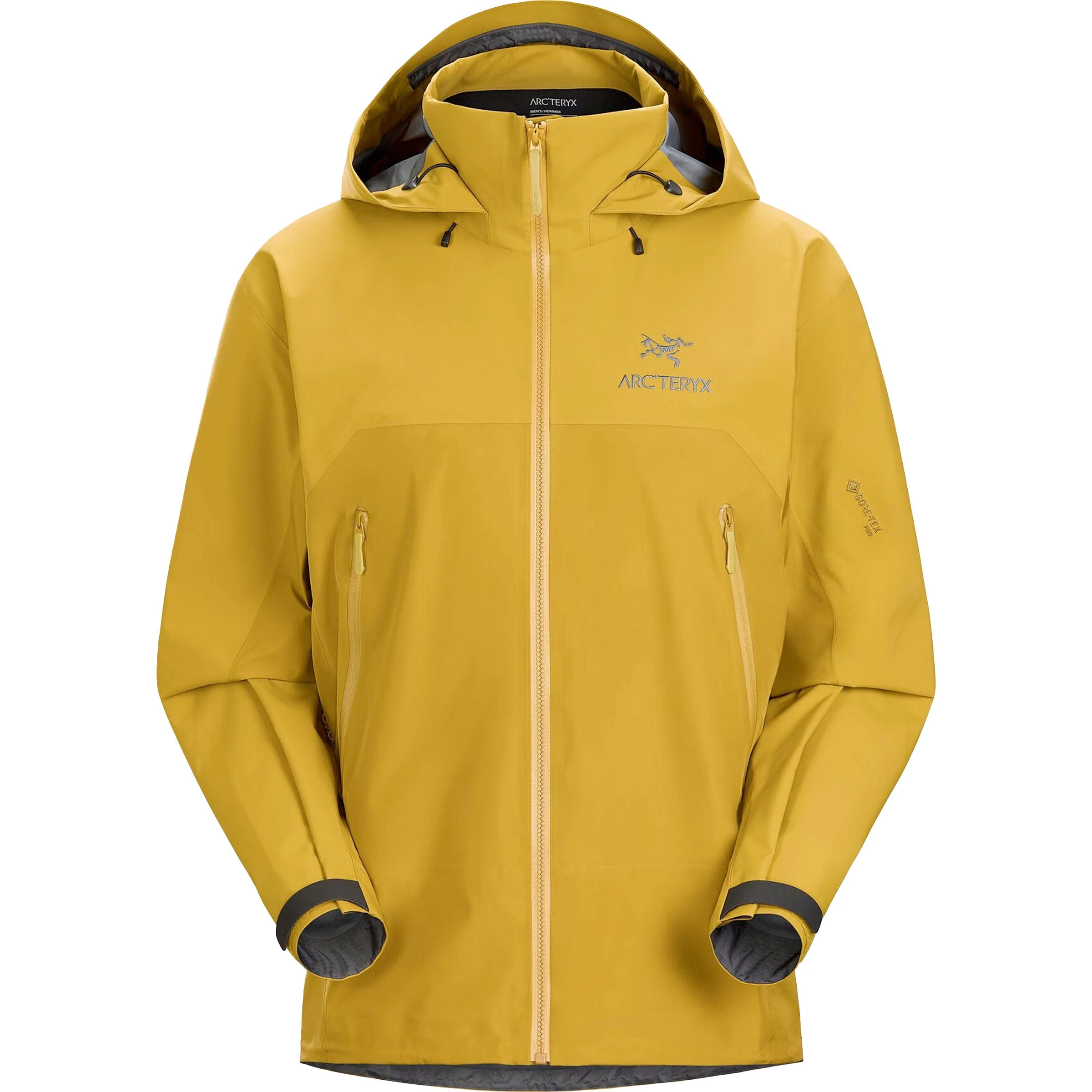 Skalljakken har en romslig hette med snørestrammere i front, strammere til hjelmfeste bak, og en stiv brem foran som tar regnet unna ansiktet. Det går en glidelås fra haken og ned langs midten, med vanntett TPU-laminering og stormklaff langs hele. Det finnes også håndlommer med glidelås på sidene og en to-veis glidelås under armene som gjør det lett å lufte ut etter skiftende vær, fra vått og kaldt til tørt og varmt. Nedekanten har også en snørestrammer. En brodert Arcteryx-logo over venstre bryst. En RECCO-refleks bak i hetten er laget for å lette søkearbeidet i tilfellet snøskred.