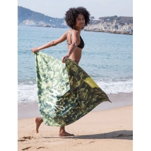 Reisehåndkle til backpacking og strandliv. Mikrofiber, med bilde av fjell og vann.