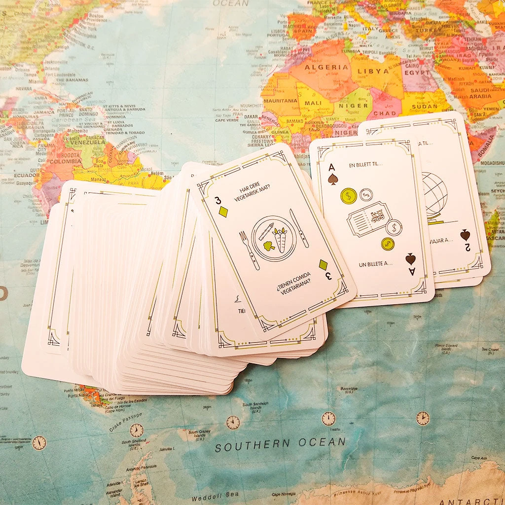 Kortstokken består av totalt 55 kort, hvor man har et standard sett på 52 merkede kort (Spar, Ruter, Hjerter, Kløver) og 3 Jokere. Hvert kort er illustrert med en tegning og et tilhørende ord, uttrykk, setning eller spørsmål med oversettelse fra Norsk, som er ment å være til hjelp i ulike situasjoner.