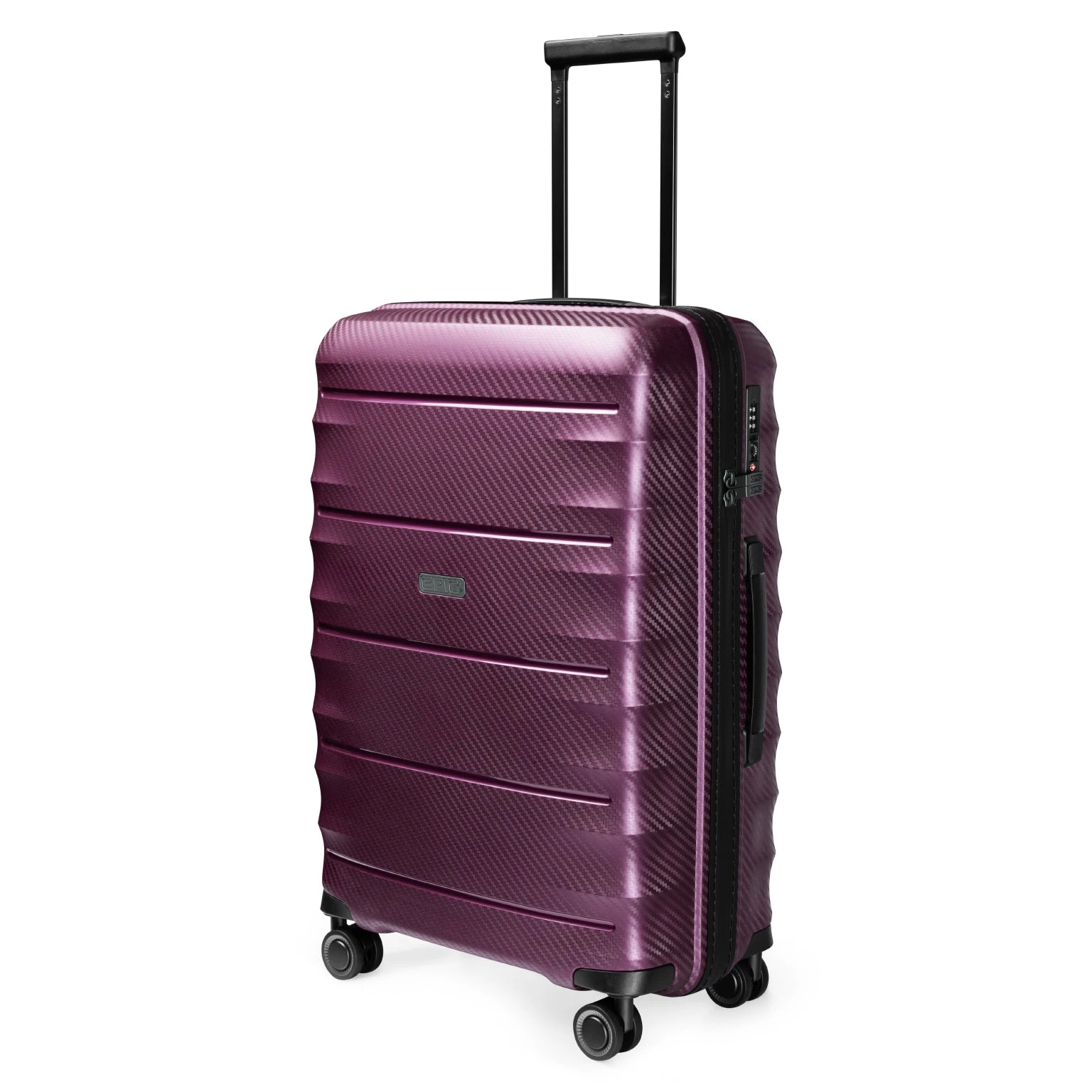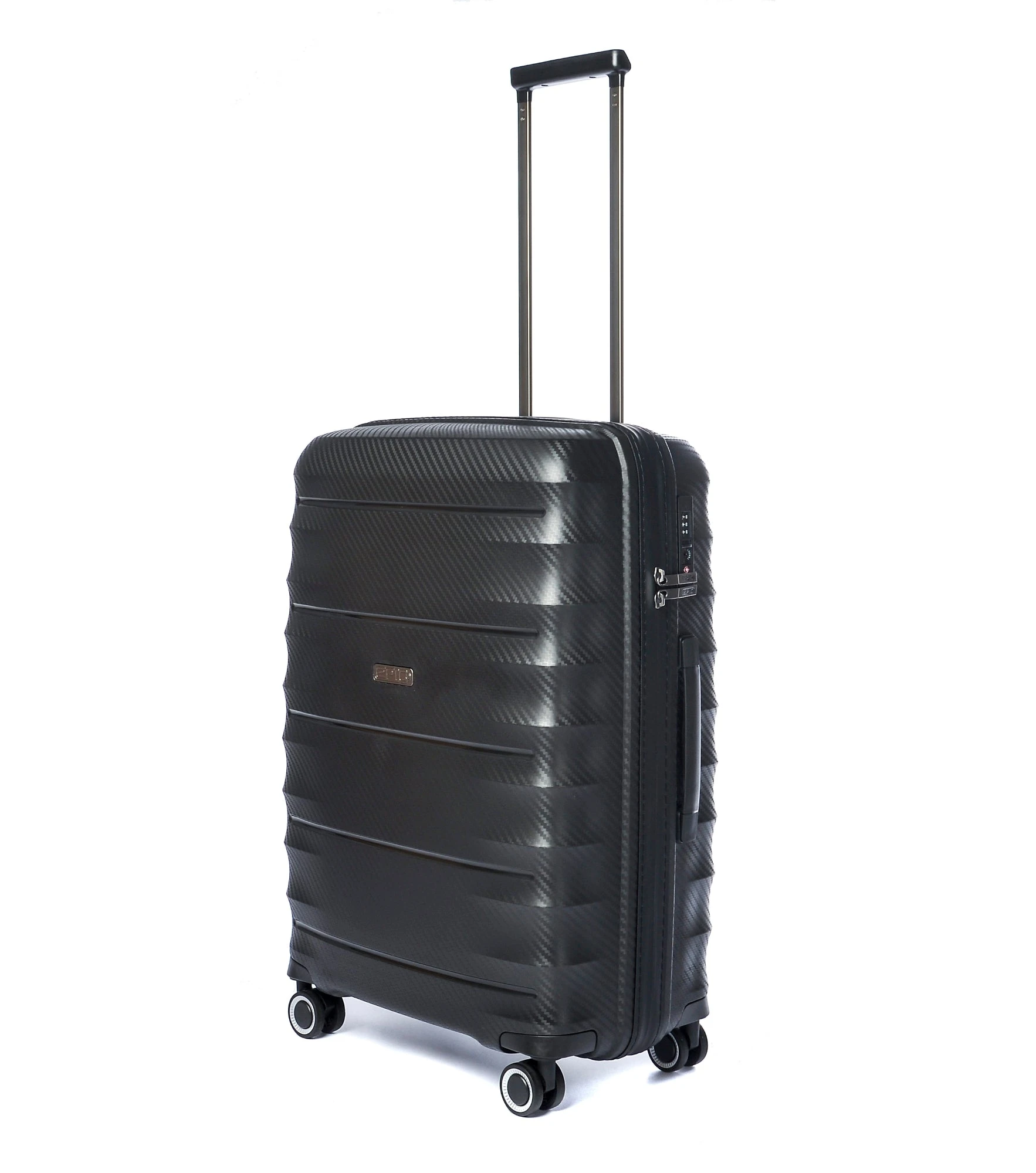 Medium koffert på 65 liter. Utrolig lett og sterkt materiale, laget i Polyporpylen med vanntette glidelåse og TSA kombinasjonslåser. 4 stk stillegående hjul.