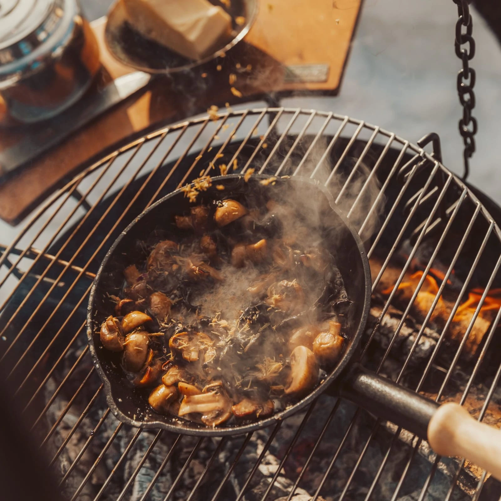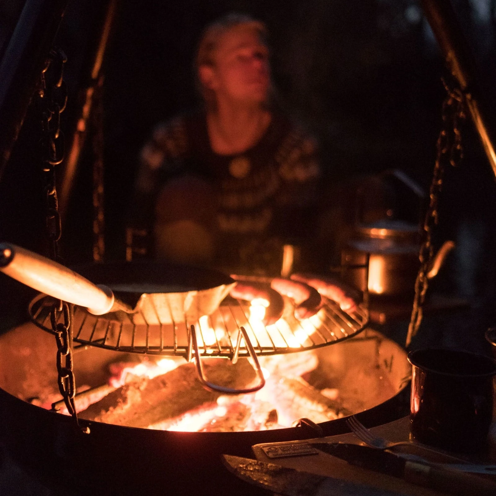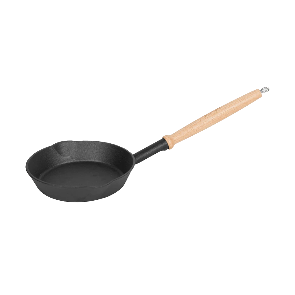 Her lukter det egg og bacon, små pannekaker og fersk ørret som krøller seg i panna. Praktisk støpejernspanne med ekstra langt skaft av tre, til bruk på bål og bålpanne. Liten nok til puttes i tursekken.