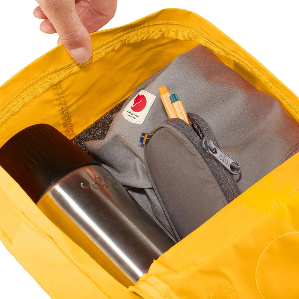 Kånken Mini er laget i et slitesterkt men lett Vinylon F-stoff, som er spesielt egnet til å avvise smuss og fuktighet. Hovedrommet har en bred glidelåsåpning som gjør det enkelt å pakke inn og ut. Det finnes to flate sidelommer til drikkeflasker eller termos, og en ekstra glidelåslomme i front som er perfekt for småting du vil ha rask tilgang til. Et medfølgende sitteunderlag i PE-skum sitter i den innvendige baklommen og fungerer som en ryggstøtte – en design-detalj som bidrar til å stabilisere ryggpanelet. Sitteunderlaget kan tas ut og er et praktisk tilbehør når man vil ta lunsjen ute i parken eller på tur i skogen. Bæresystemet er enkelt, og består av smale justerbare skulderremmer og et bærehåndtak på toppen. Den klassiske Fjellreven-logoen i front er reflekterende i mørket, og det finnes en adresseetikett i hovedrommet med plass til navn og adresse.