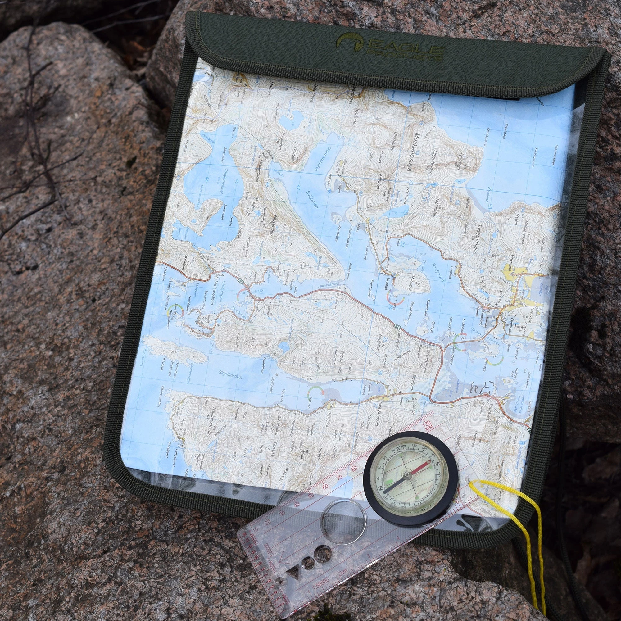 ✔ Kartmappe med stort vindu, regulerbar halssnor og kompasslomme.