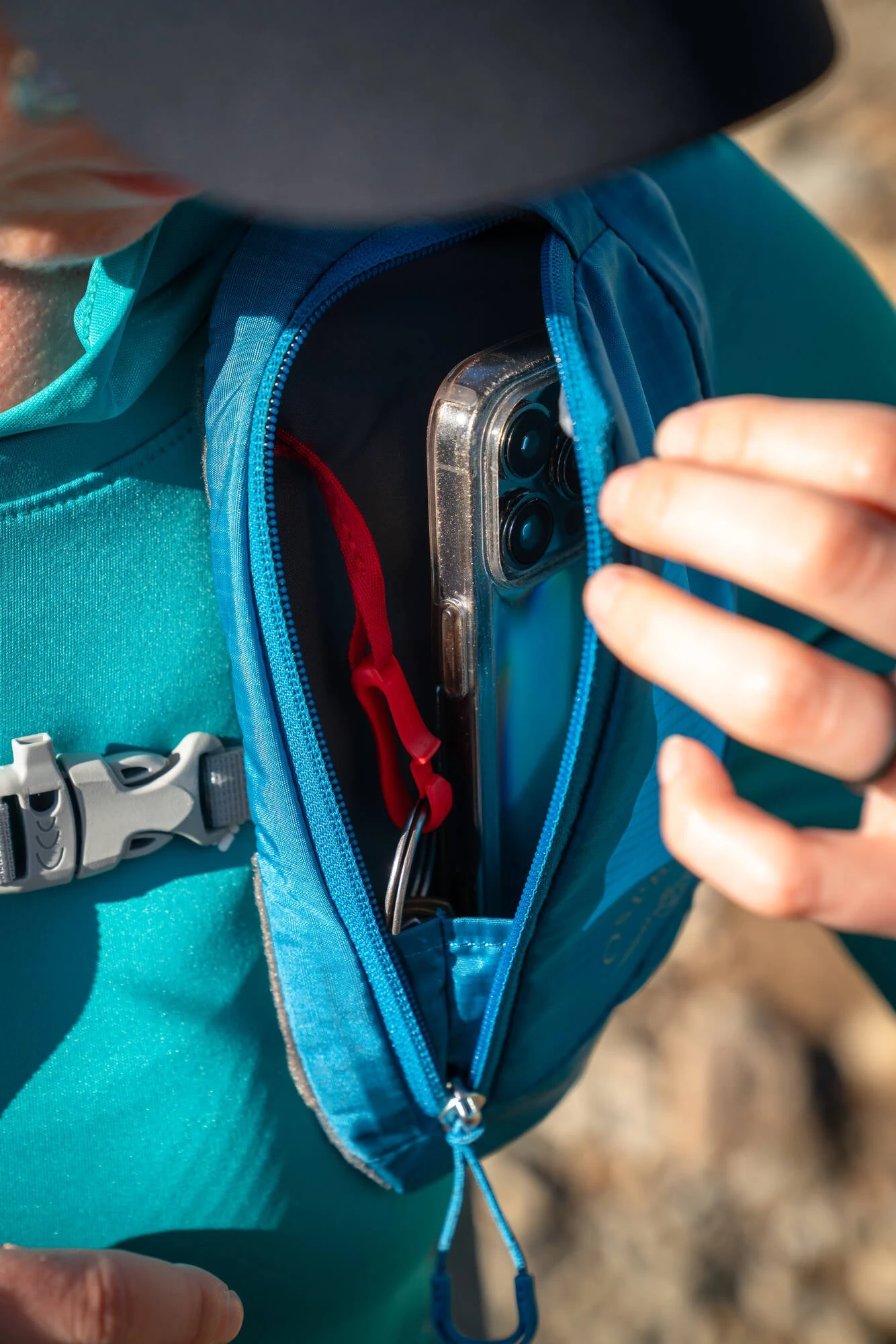 Ekstra ryggsekklomme til å feste på skulderstroppen eller hoftebeltet.