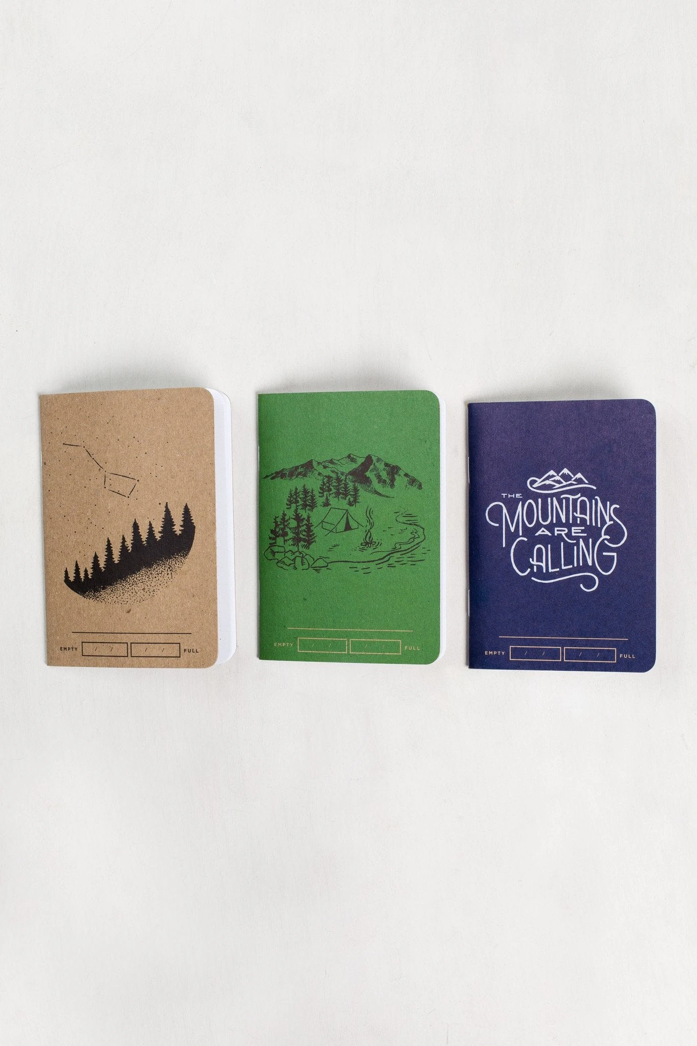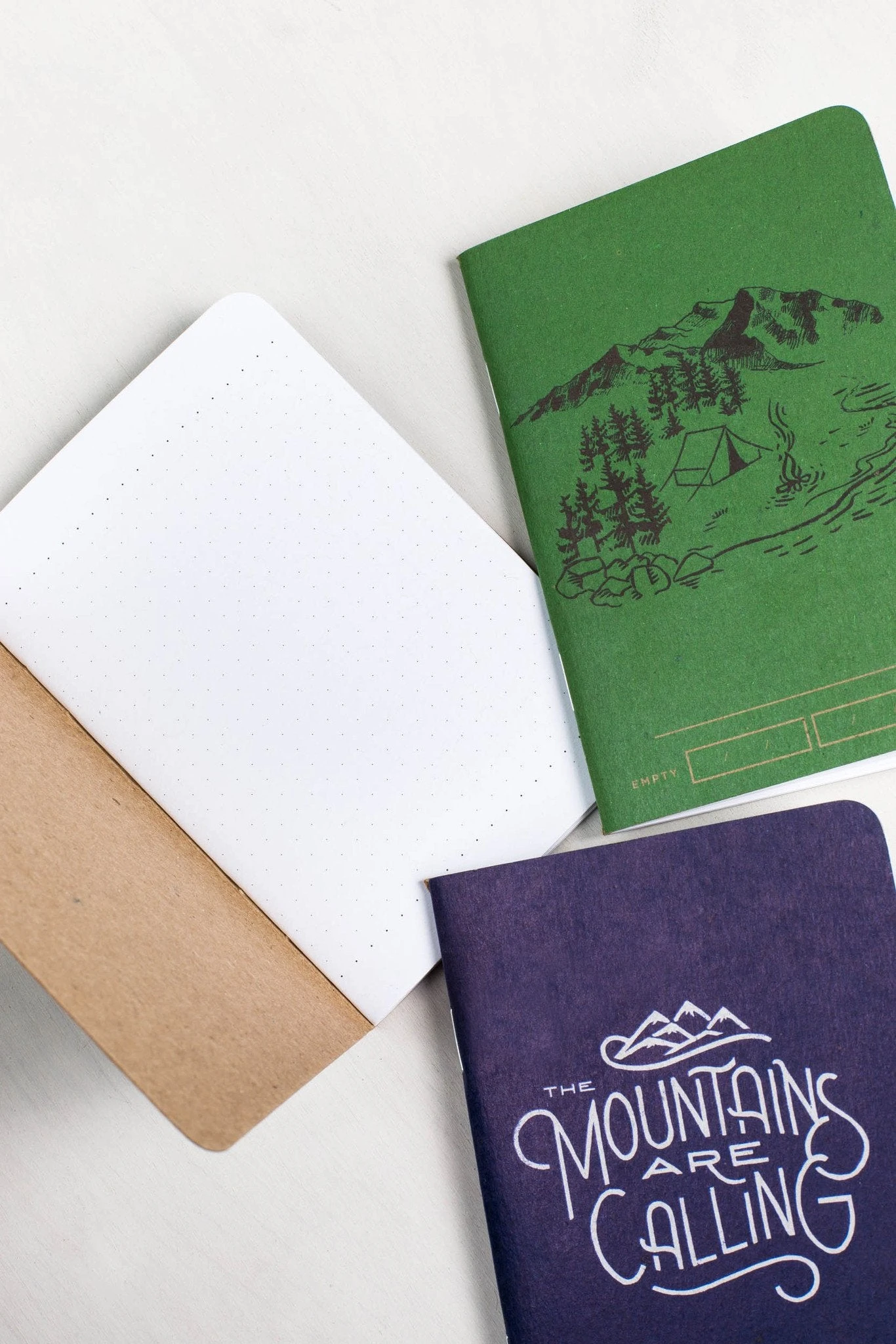 Små, fine notatblokker uten linjer, i forskjellige omslag.