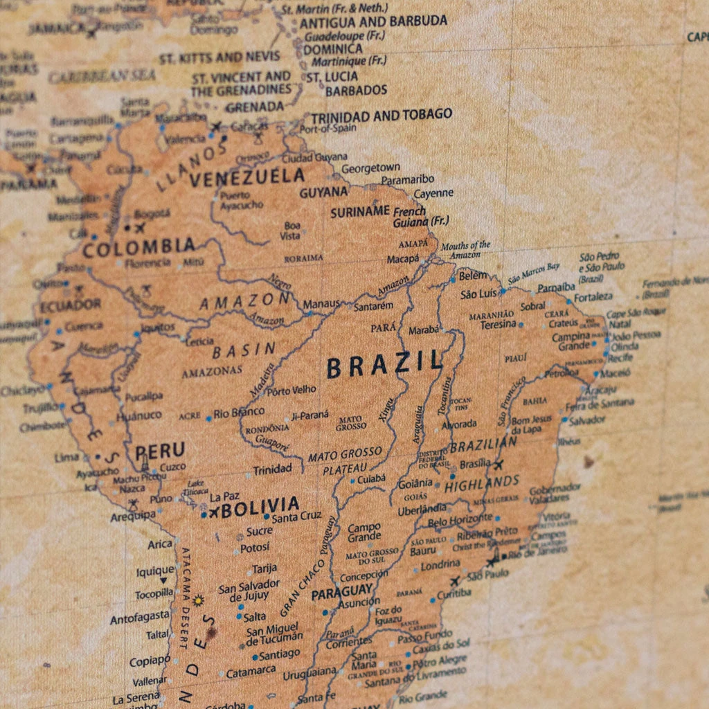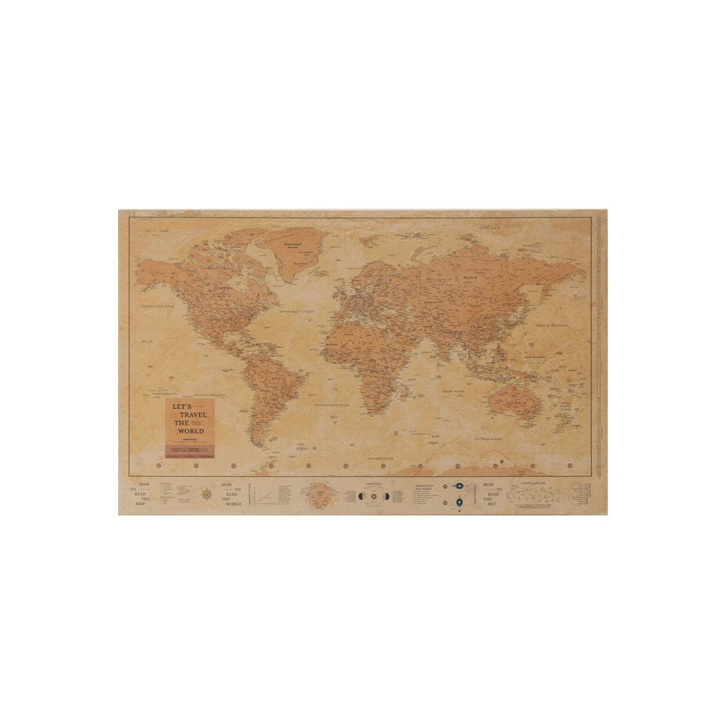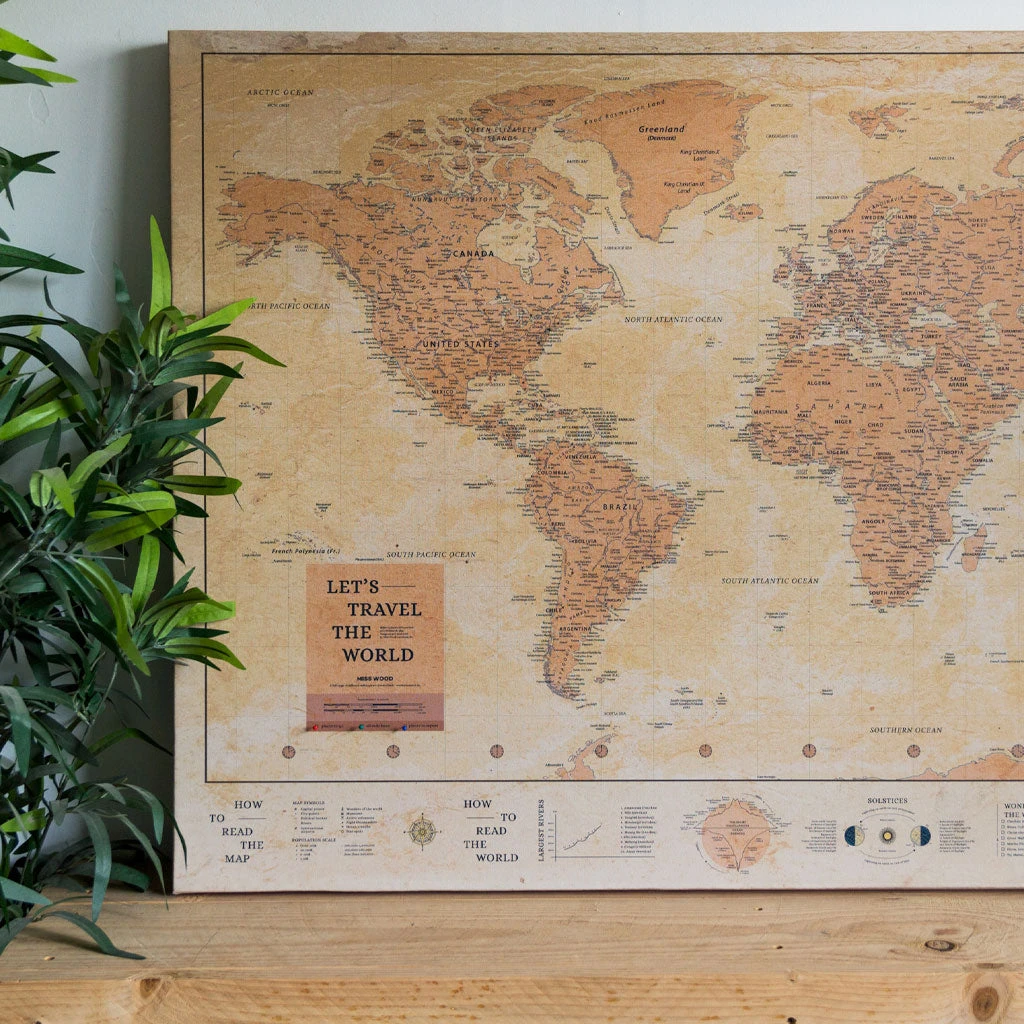 Verdenskartet er detaljert, med interessante fakta og informasjon på undersiden, og er trukket over et lerret som gjør opphenget via de medfølgende L-krokene og skruene raskt og enkelt, og skaper samtidig en estetisk dybde på veggen der det henges opp.